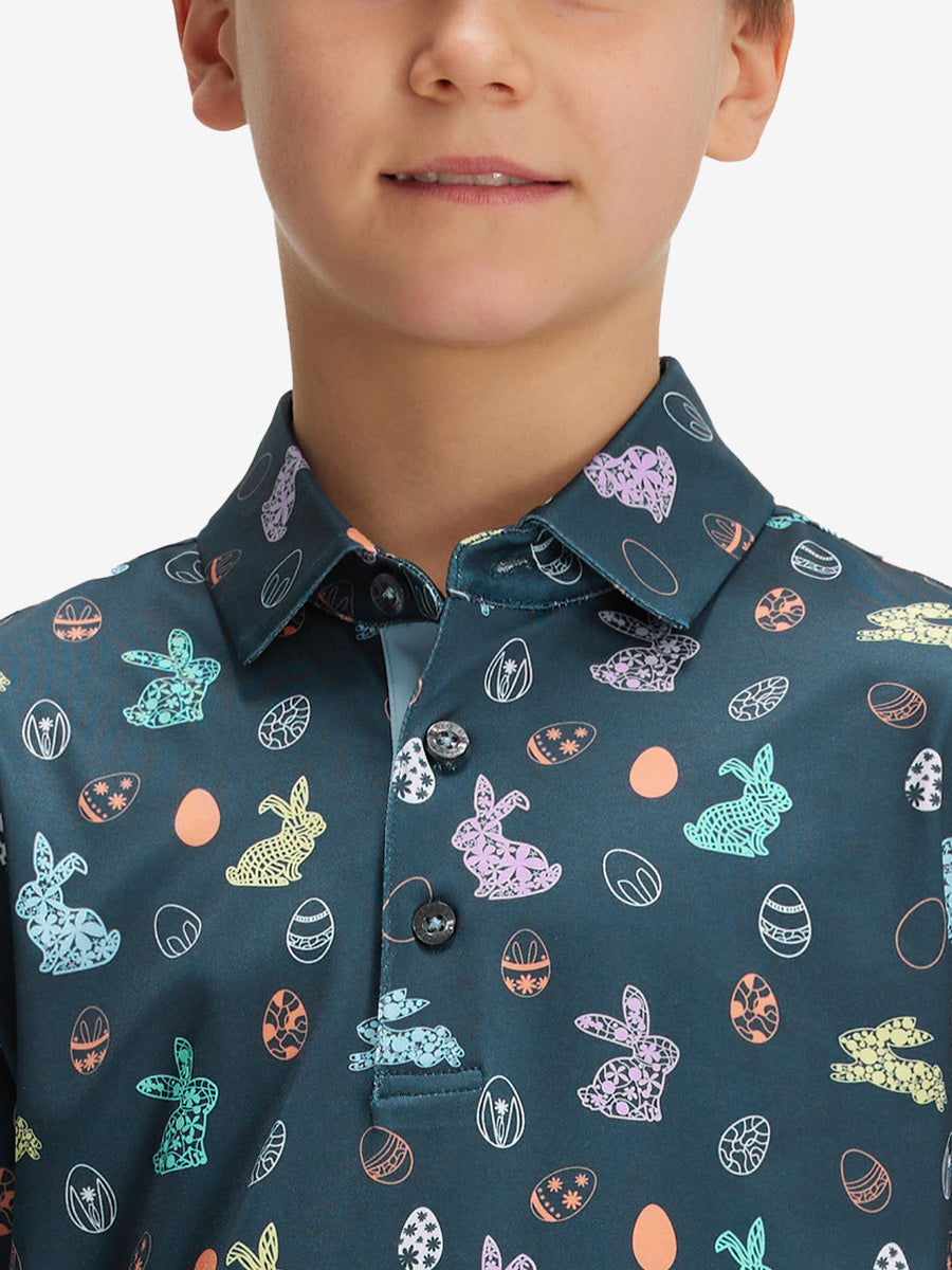 Get your little golfer ready for adventures with our Performance Print Boys Golf Polo. Crafted from top-notch fabric that wicks moisture, stays light, and shields with UPF 30+. Let him swing freely with the split hem and stretchy fabric. Watch him rock the course in fun animal and plant prints that never fade, making him the cutest golfer around!