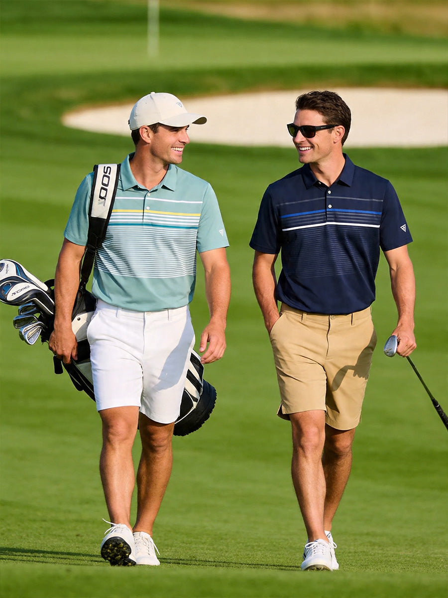 Introducing our "Chest Print Polo Shirts" for men. These golf shirts are crafted for performance with dry-fit, breathability, moisture-wicking, and quick-dry features. The 4-way stretch and UPF 50+ protection keep you dry and cool on the golf course, enhancing your performance. Stand out with the unique colorful pinstripe print design on the front chest, adding a fashionable touch to these elegant golf polos that showcase your style and temperament.