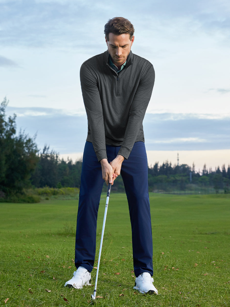Meet our Quarter Zip Melange Pullover, the ultimate choice for golf aficionados. This men's sweatshirt is all about style and performance, featuring a sleek quarter zip placket with a windproof flap for that modern touch and easy temperature control. Crafted from a high-performance 4-way stretch brushed knit of polyester and spandex, it offers moisture-wicking, lightweight, and breathable comfort, ensuring you move with ease and style on the golf course. Elevate your game with comfort and sophistication!