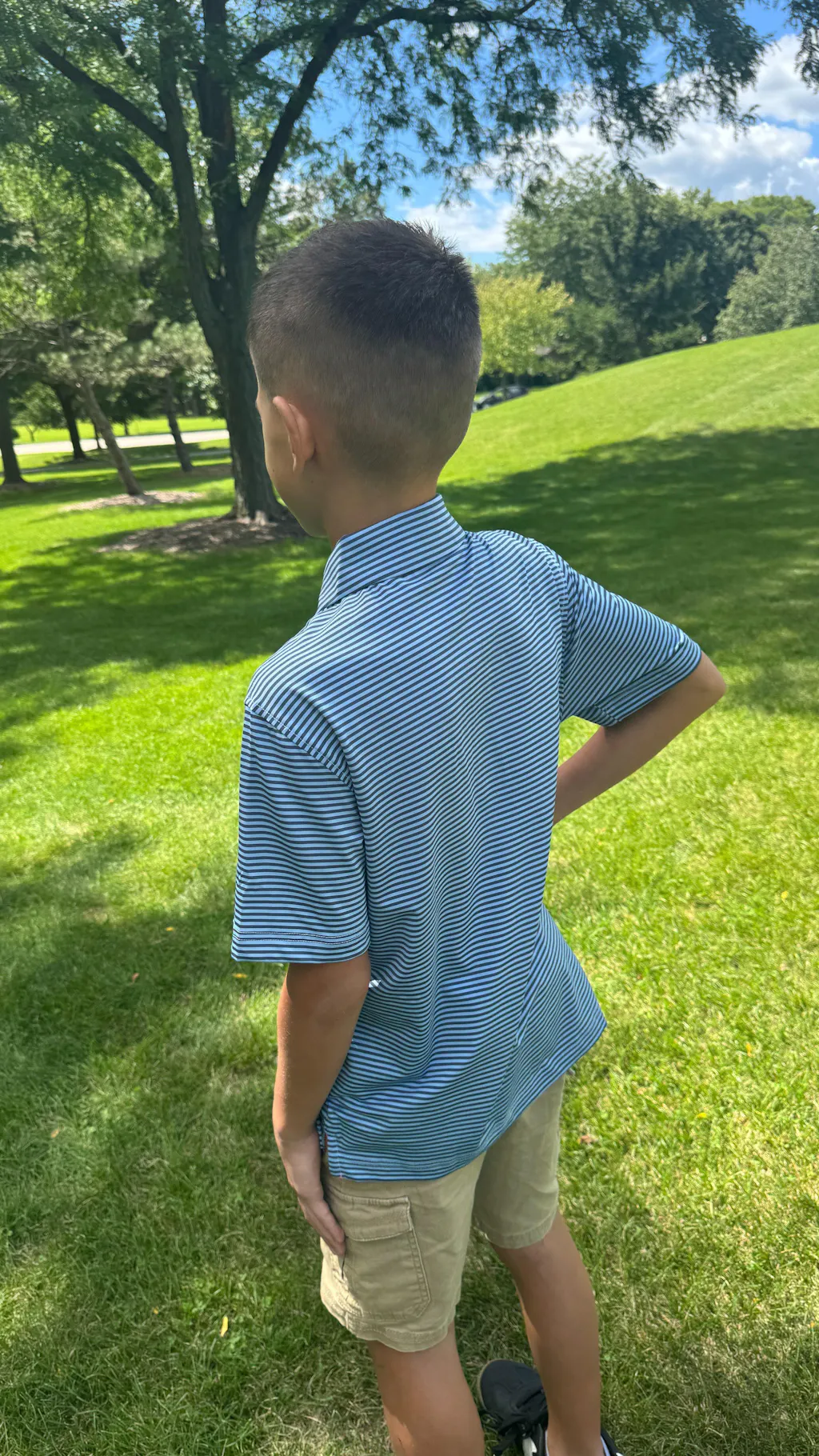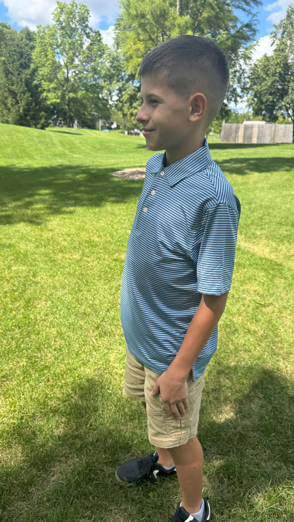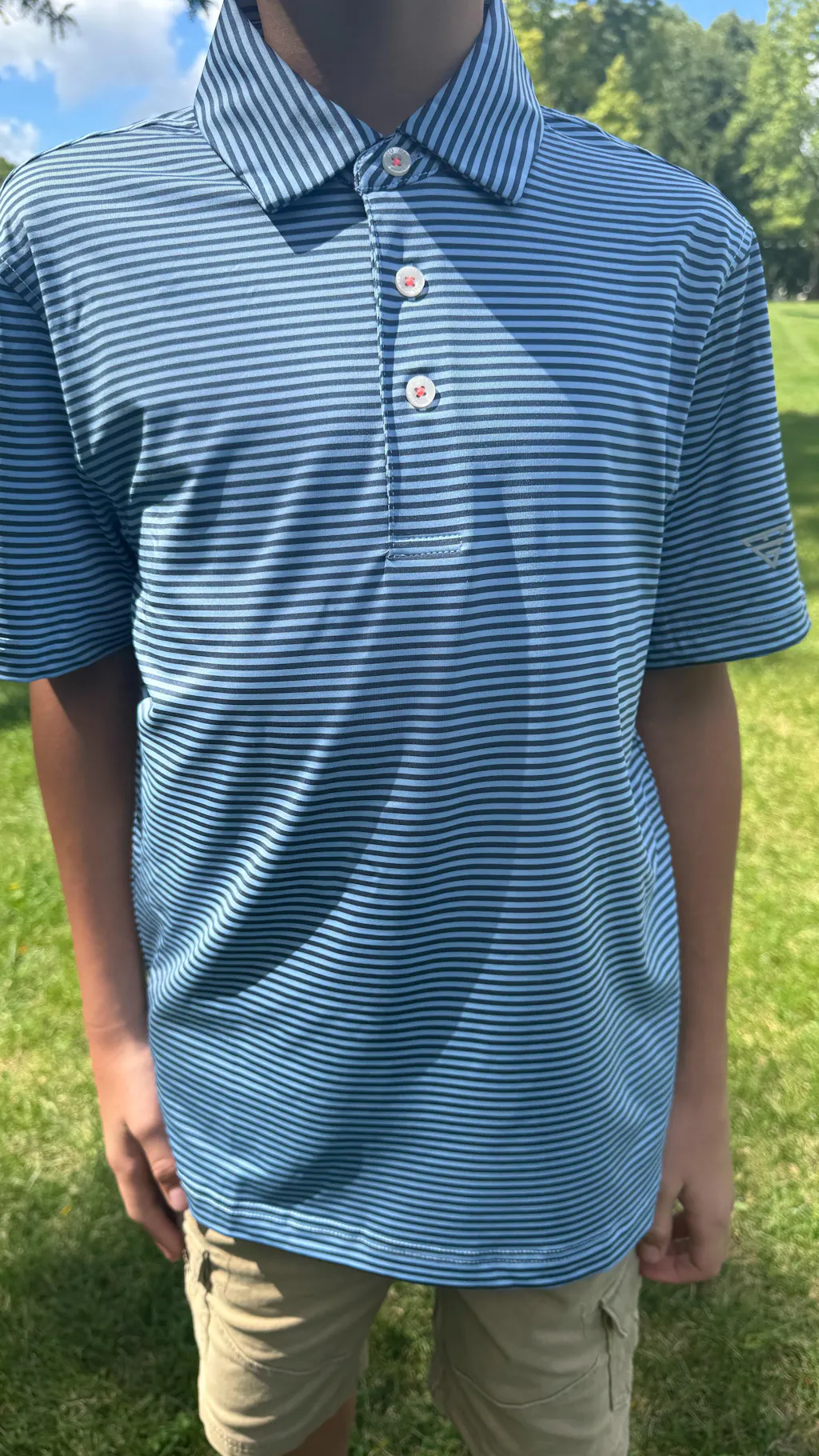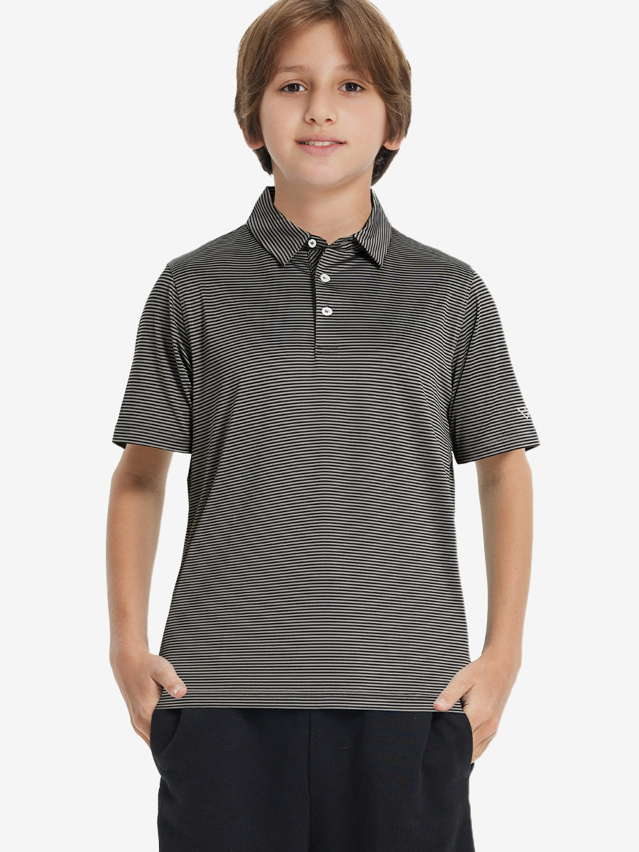 Performance Cooling Polo - Youth crafted from polyester spandex striped jersey. Lightweight, moisture-wicking, quick-drying, UPF 30+, soft hand-feel, 4-way stretch for comfort and breathability. Special construction ensures a no-curl collar and maintains shape.