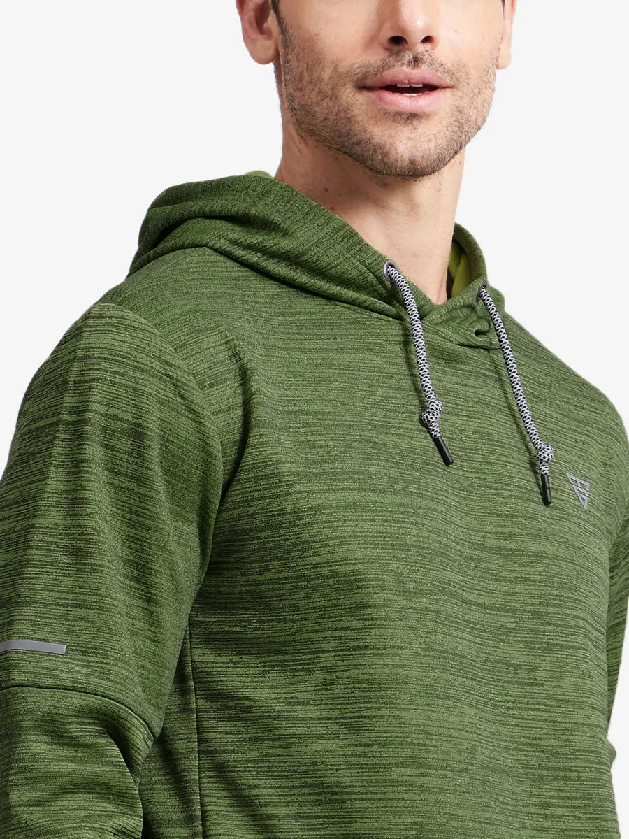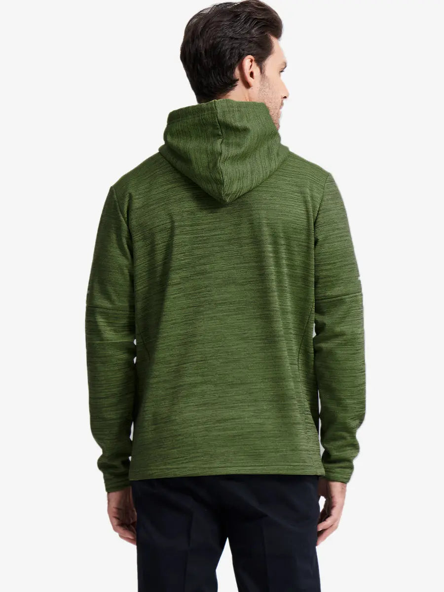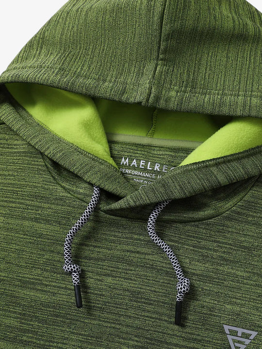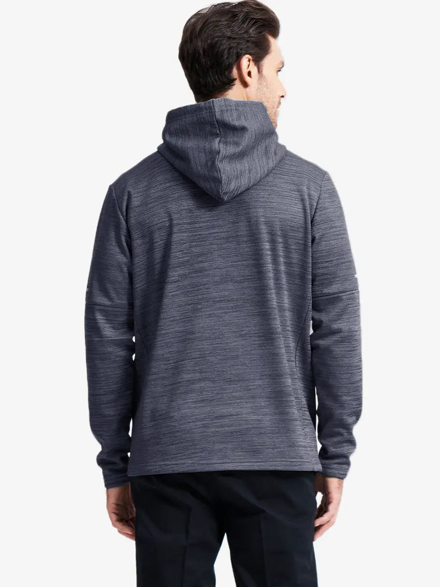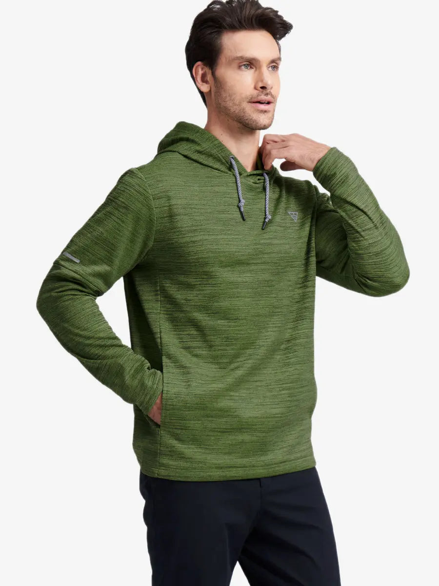 This is a pretty solid hoodie. It has that performance-style material on the outside with a fleece lining on the inside, and the added waffle knit gives it a bit more style than your standard athletic hoodie. The exterior is fine overall, though it does tend to snag on my dry hands a little, but it's not rough or uncomfortable. The inside is definitely softer thanks to the fleece.