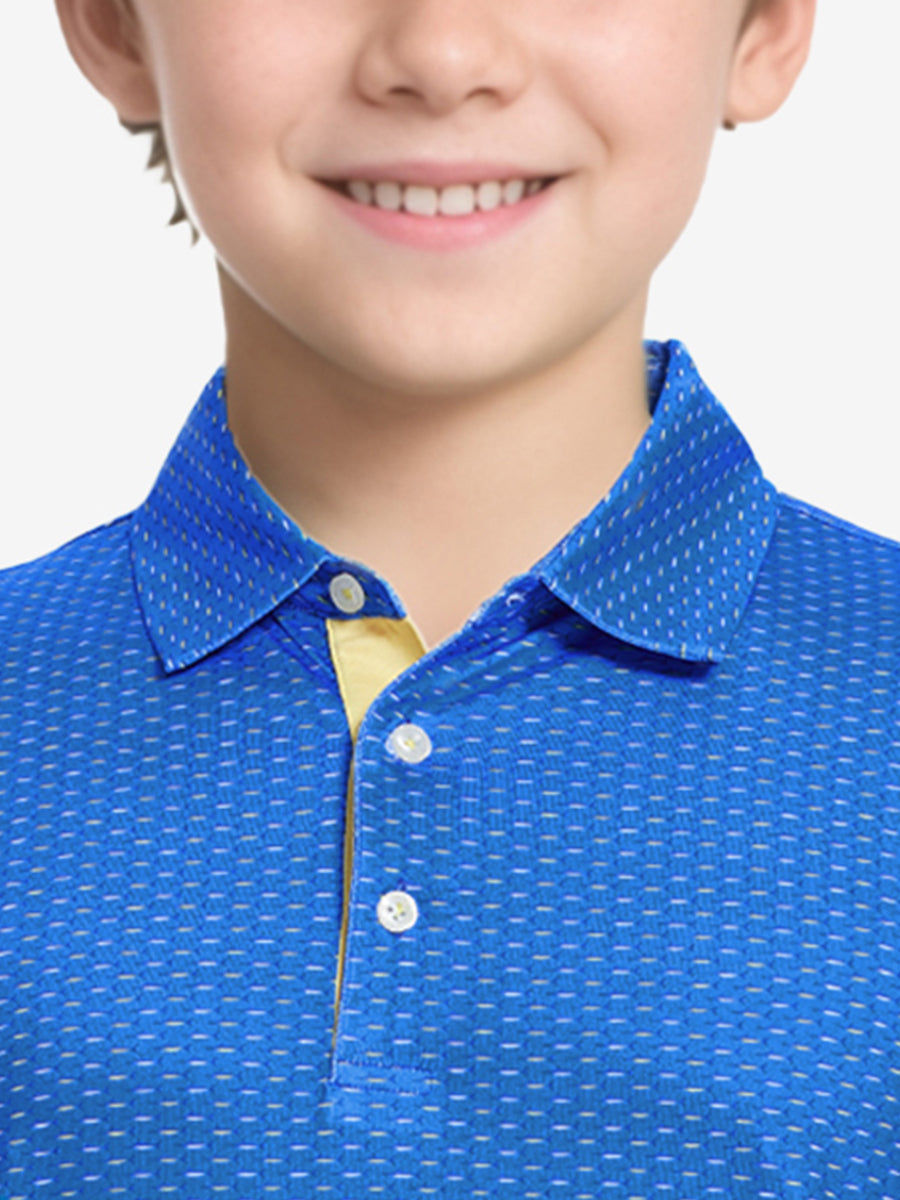 Get your little golfer ready for adventures with our 'Performance Print Boys Golf Polo.' Crafted from top-notch fabric that wicks moisture, stays light, and shields with UPF 30+. Let him swing freely with the split hem and stretchy fabric. Watch him rock the course in fun animal and plant prints that never fade, making him the cutest golfer around!