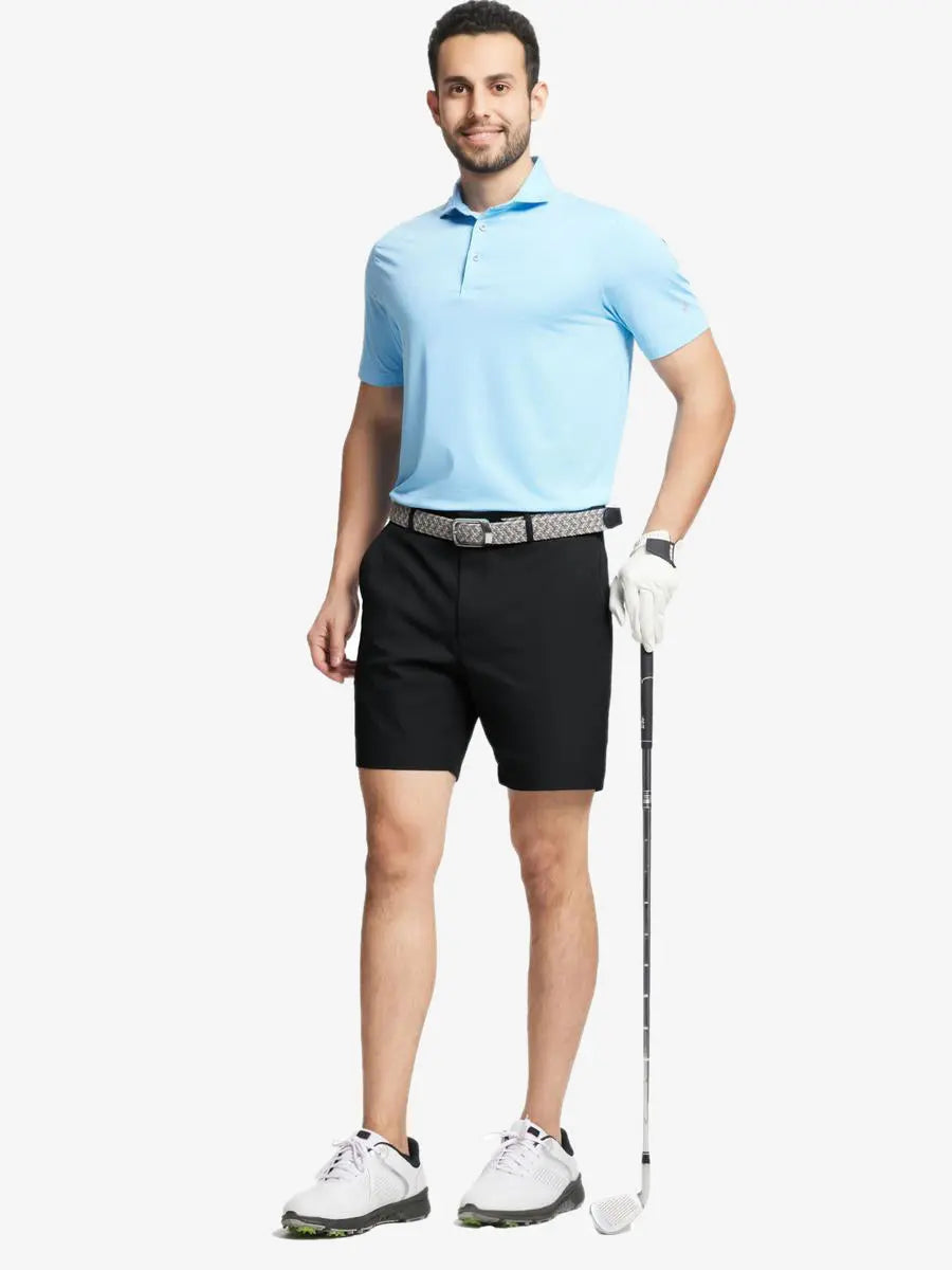Elevate your game with our Water Resistant Golf Shorts for men. Crafted from premium polyester, these lightweight shorts offer moisture-wicking properties, easy care, and UPF30+ sun protection. Designed for comfort and flexibility, they keep you cool and allow a full range of motion. The secure closure with buttons and a zipper fly ensures a perfect fit, perfect for a flawless golfing experience.